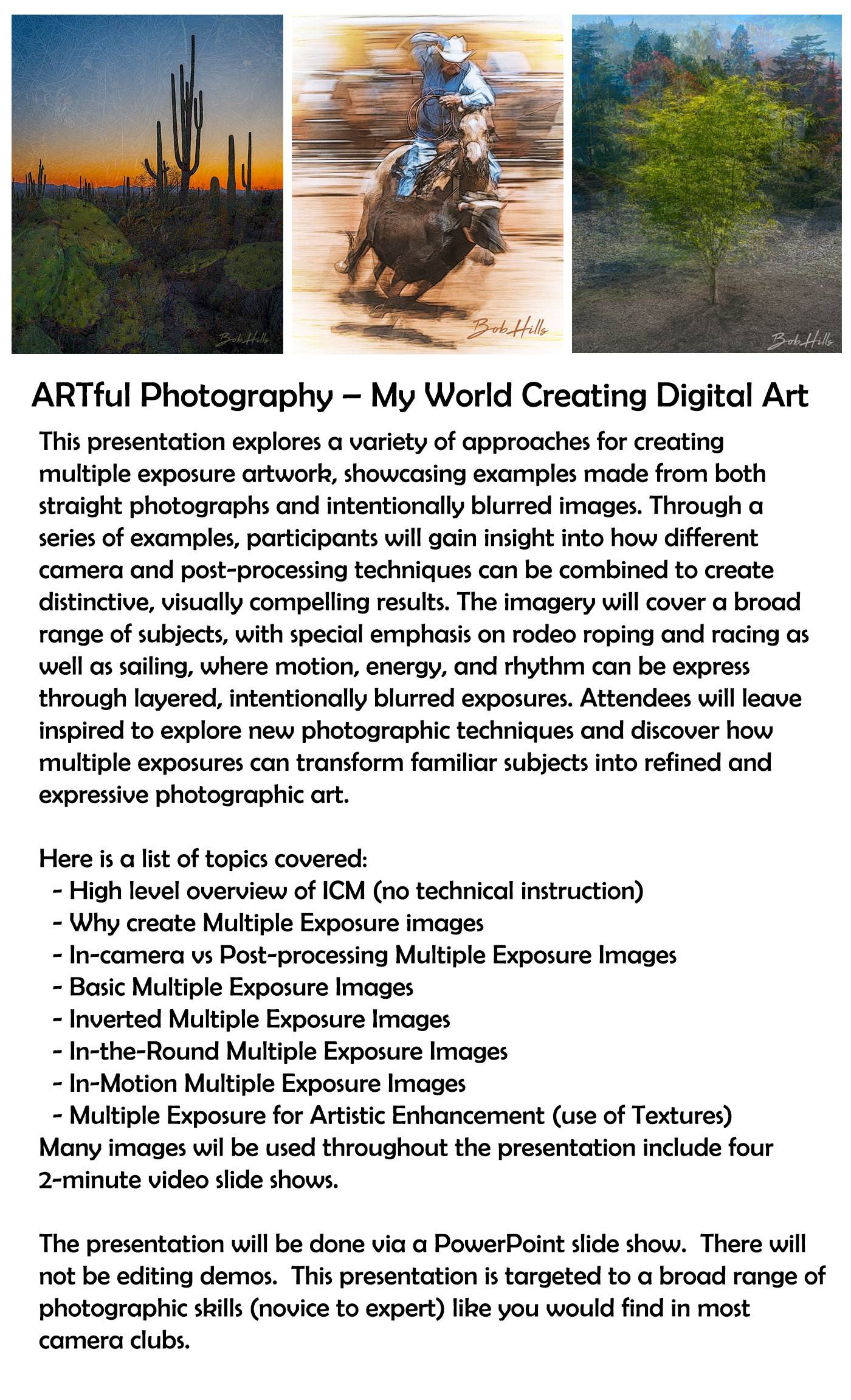 Having been on the board of a camera club, I understand that it can be difficult to line up affordable speakers to do presentations at club meetings. I started developing presentation aimed at audiences interested in various aspects of photography. Some of the presentations have been on very basic photography principles, while others are very specific to a task or specific type of photography or subject. The presentation below is what I am currently offering to camera clubs. If I have enough interest from individual photographers, I will hold an independent session. If you or your club is interested in the current presentation, please use the Contact page on this website.